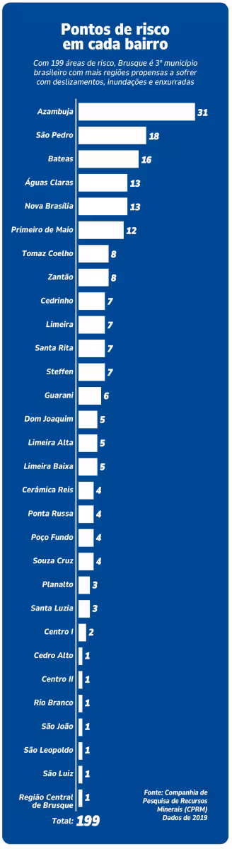 Terceiro município do Brasil com mais áreas de risco, com 199 locais, segundo o Serviço Geológico do Brasil, além dos alagamentos, Brusque precisa lidar com uma de suas principais consequências: os deslizamentos. Atualmente, a estimativa é de que 14 mil pessoas habitem esses espaços, segundo o coordenador da Defesa Civil de Brusque, Edevilson Cugiki.