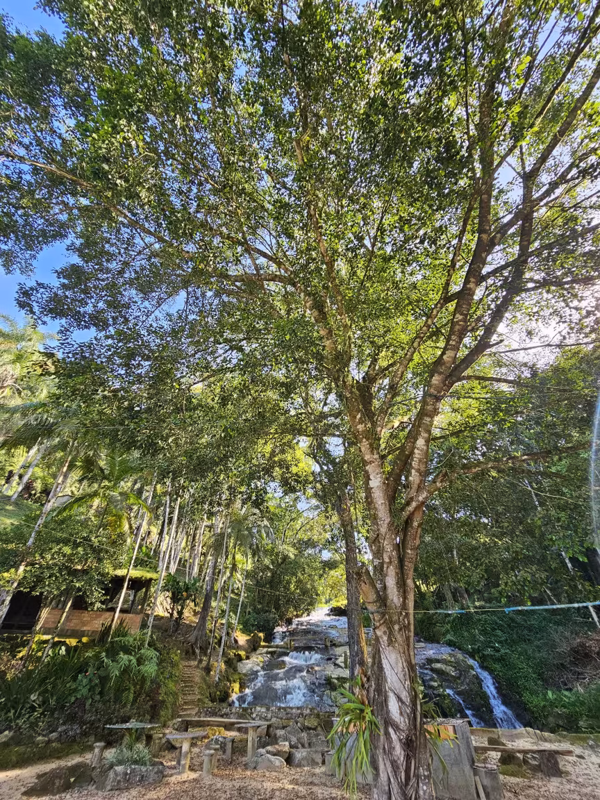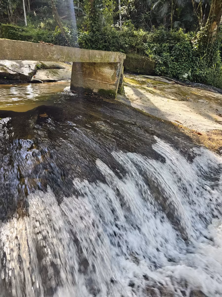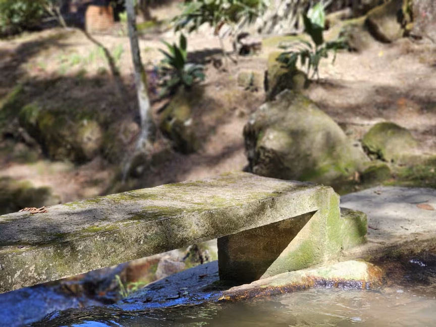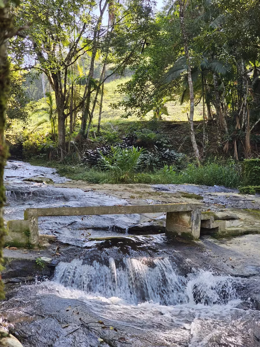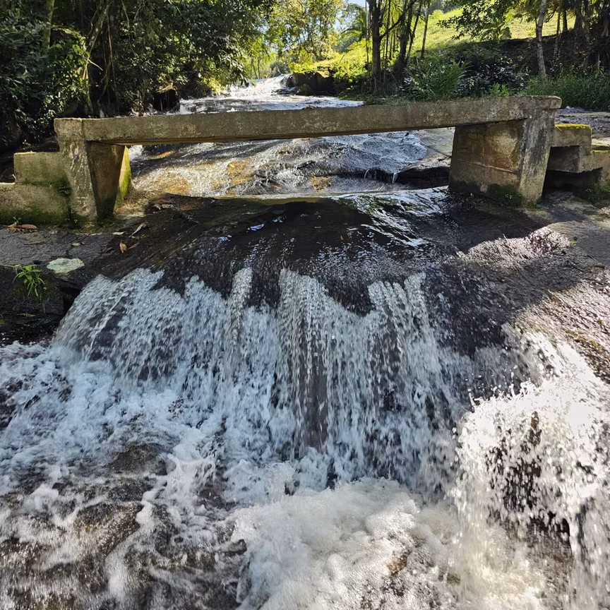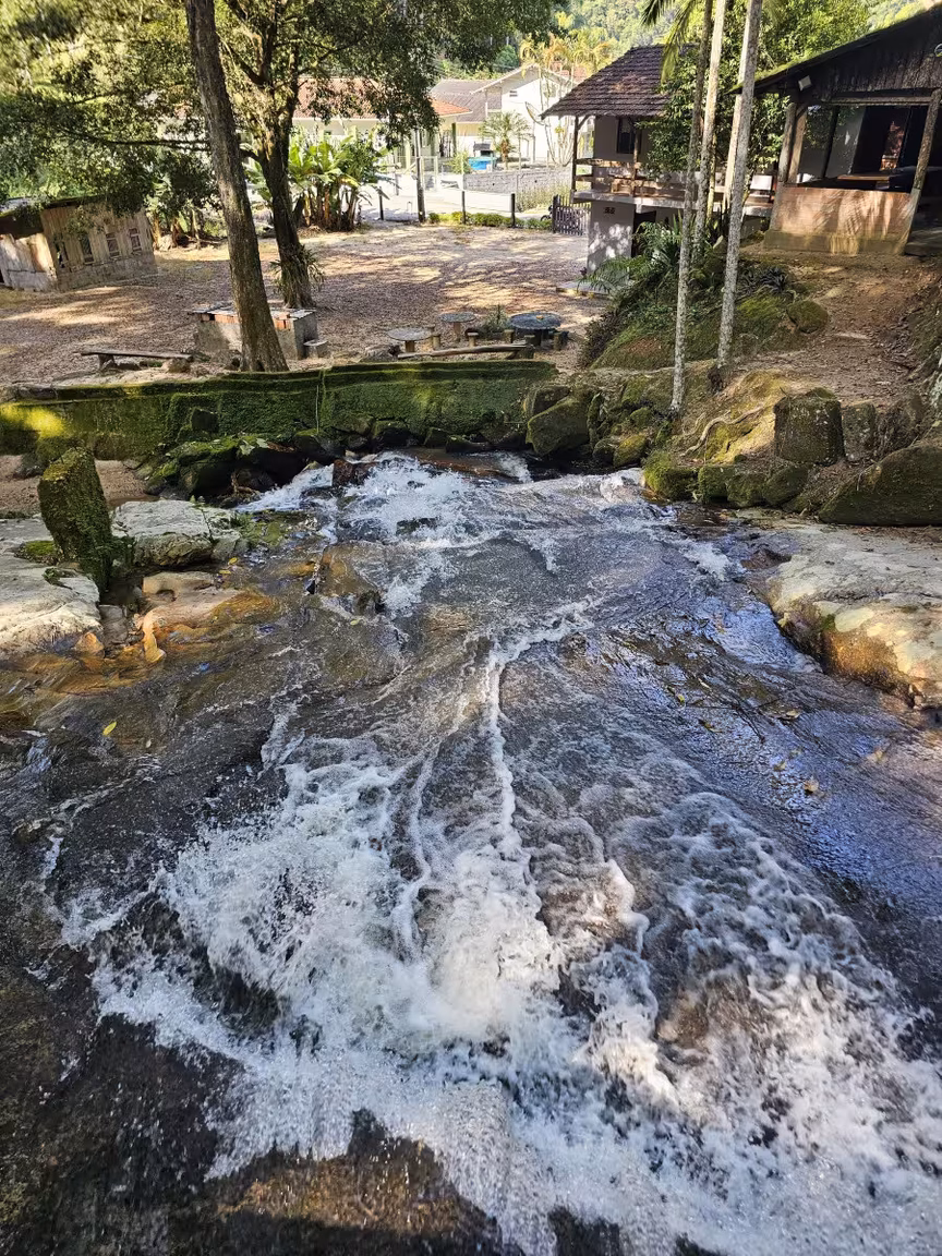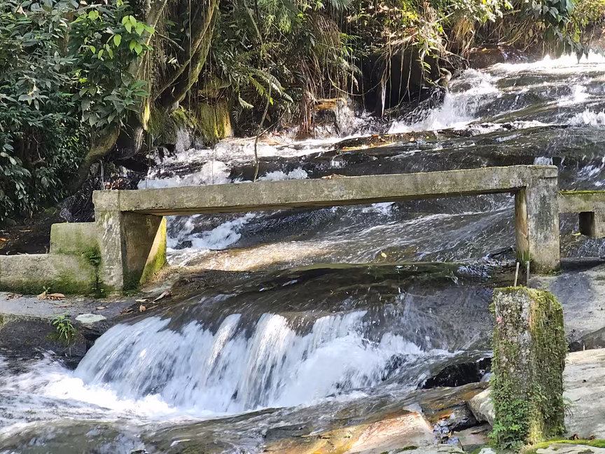 O quiosque permanece de pé, assim como as mesas sob as sombras das árvores, onde os banhistas costumavam desfrutar de petiscos e bebidas após um mergulho revigorante na cachoeira.