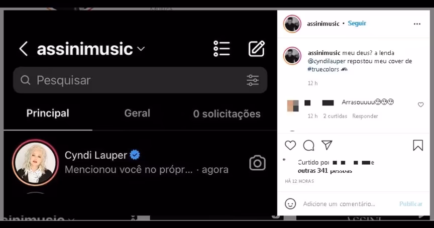 O músico Assini, de 25 anos, morador de Botuverá, teve um story do seu Instagram mencionado no perfil pessoal da cantora americana Cyndi Lauper. O fato aconteceu na noite desta segunda-feira, 25.