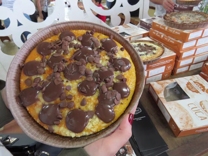 O Mercado da Cuca ocorre desde a abertura do evento nesta sexta-feira, 15h. São ofertados diversos sabores. O valor da cuca tradicional é de R$ 22 e a gourmet custa R$ 27.