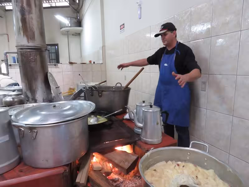 “Foi feito o prato típico de Botuverá, muita polenta, com bom vinho, quentão, pinhão e queijo para a festa ficar boa”, conta o coordenador. O grupo de cozinheiros trabalhou sem parar para dar conta da demanda. A todo momento, alguém estava mexendo um panelão de polenta – que está entre as preferidas do público, junto ao macarrão caseiro.