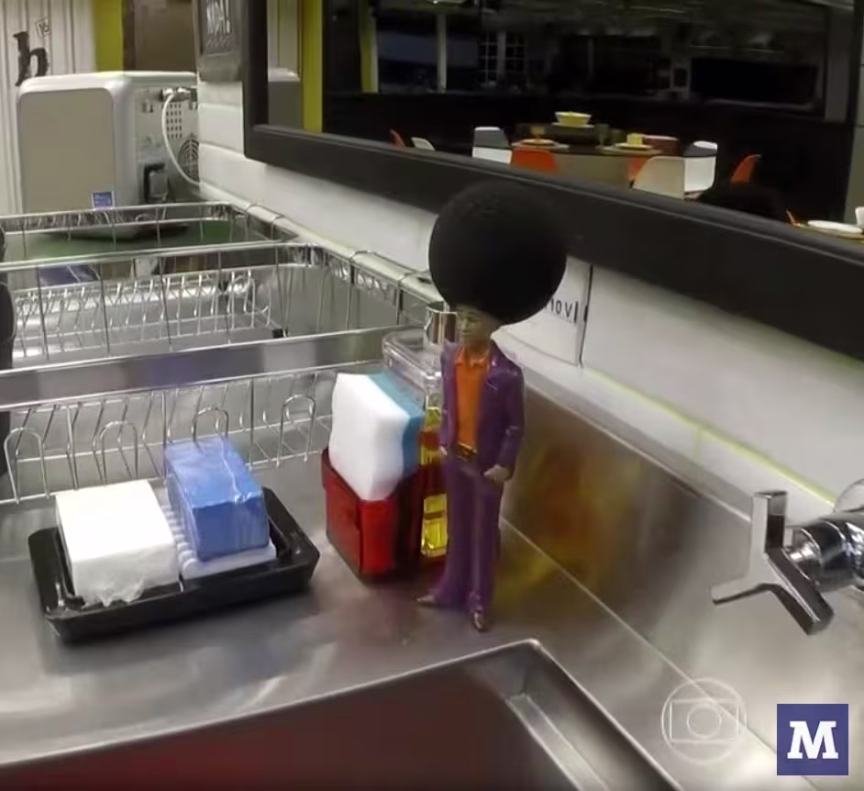 Enquanto a adição de novas bonecas com novos tipos de corpo e tons de pele da Barbie é aplaudida, uma polêmica envolve um boneco-esponja que apareceu para “causar” na edição 16 do reality show Big Brother Brasil. Acontece que um dos objetos que compunham a pia, era um boneco-esponja negro, cujo cabelo Black-power era utilizado para lavar a louça. Não demorou muito para que uma chuva de comentários críticos ao tal boneco enchesse a web. Esses comentários alegavam que tal boneco só reforça o preconceito, comparando o cabelo crespo “ruim” com uma esponja de aço.