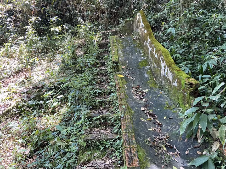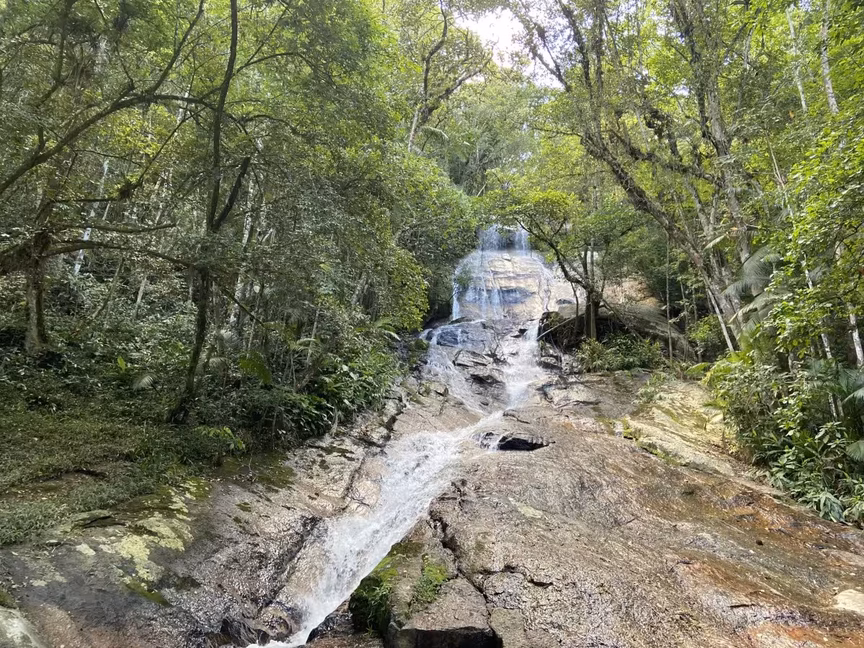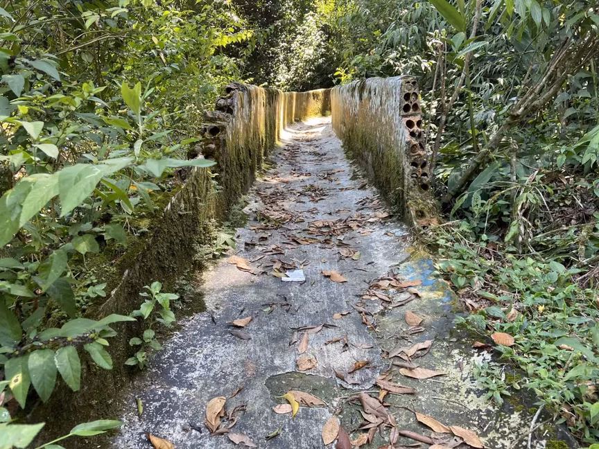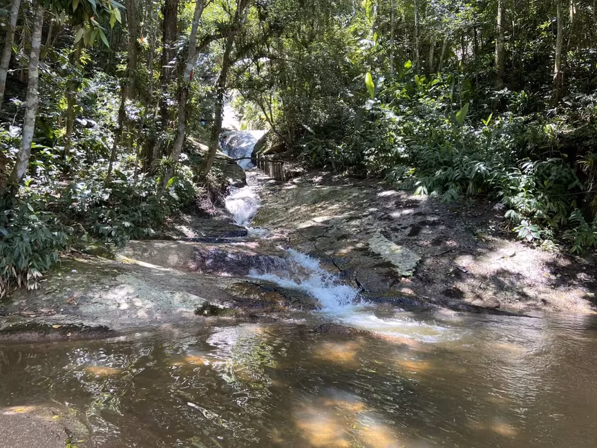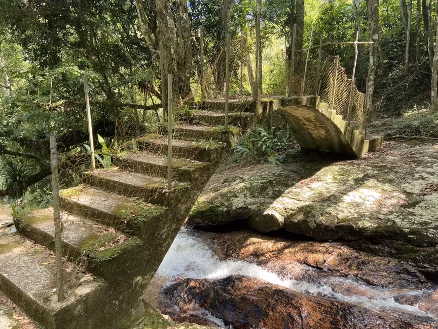 Logo após a antiga piscina, o visitante precisa subir uma pequena trilha para chegar até a cachoeira. Parte do local conta com uma escada de concreto para facilitar a subida, que também está cercada pelo mato.