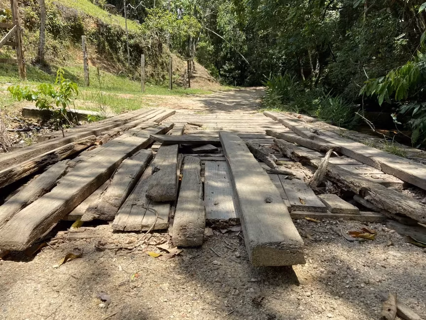 Na estradinha estreita que leva até a cachoeira, o pontilhão de madeira está totalmente danificado. Os moradores relatam que muitos visitantes se arriscam e passam com carro ou moto pelo pontilhão, por isso, a preocupação é que um acidente ocorra no local.