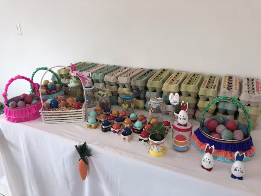 Neste ano, pela primeira vez, a creche municipal Joanna Cassaniga Fumagalli começou a enfeitar casquinhas de ovos para vender. A ideia partiu da diretora Ketley Cristina Battisti Archer de Souza, que vinha guardando os produtos desde o ano passado, na intenção de presentear as professoras.