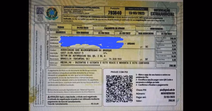 Uma falsa “Notificação Extrajudicial”, tendo com o nome “Associação das Microempresas de Brusque” tem sido recebida por algumas empresas, com a cobrança de uma “Taxa Associativa”.