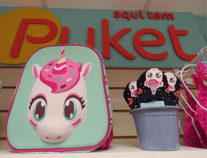 A Puket é referência em produtos infantis. A sua coleção de verão apresenta peças únicas, divertidas e repletas de atitude. A marca conta com uma grande variedade de itens, passando por pijamas, lingeries, meias e acessórios. A Puket também tem a linha praia com biquínis, maiôs e camisetas. A coleção chega com as estampas dos personagens, contendo proteção UV. Na linha escolar, estojos, nécessaire e mochilas em tamanhos e estampas variadas, além da opção com ou sem rodinhas. As lancheiras térmicas com gel combinam com copos, criando o kit completo para ir à escola.