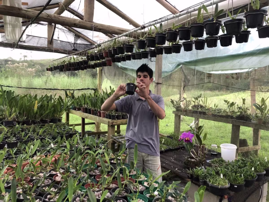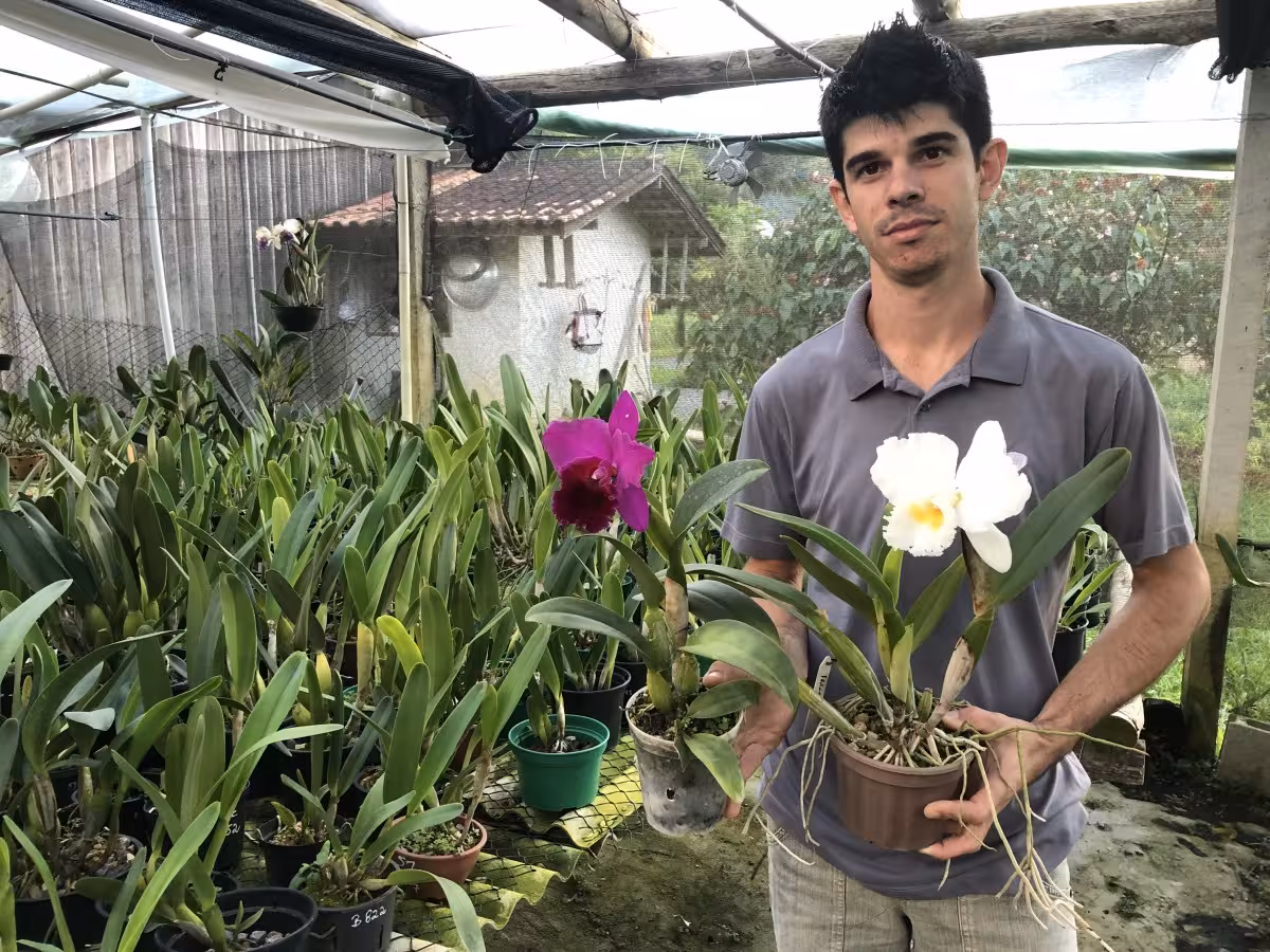 Em casa, Frânsoa já construiu duas estufas para abrigar suas plantas. Elas possuem sistema automático de irrigação e aquecimento para proteger as mudas, desenvolvidos pelo próprio jovem. “Trabalho com meus pais na empresa de aipim da família, mas todo meu tempo livre me dedico ao orquidário, que é minha paixão, meu hobby”, diz.