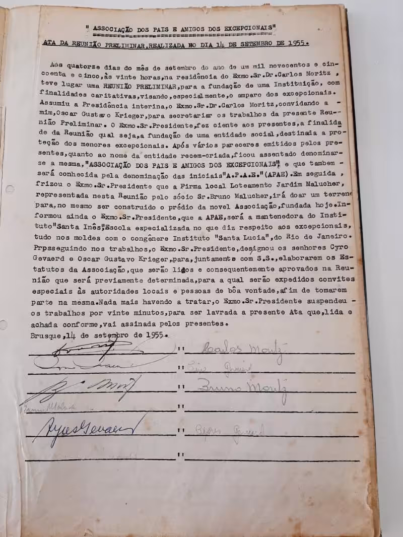 E assim, em reunião realizada na própria residência da família Moritz, no dia 14 de setembro de 1955, com a participação de membros da comunidade, como Oscar Gustavo Krieger, Cyro Gevaerd, Bruno Moritz, Ayres Gevaerd e Bruno Maluche, foi fundada a Apae de Brusque e constituída a primeira diretoria ‘provisória’ da instituição, tendo como presidente, o próprio Dr. Carlos Moritz.