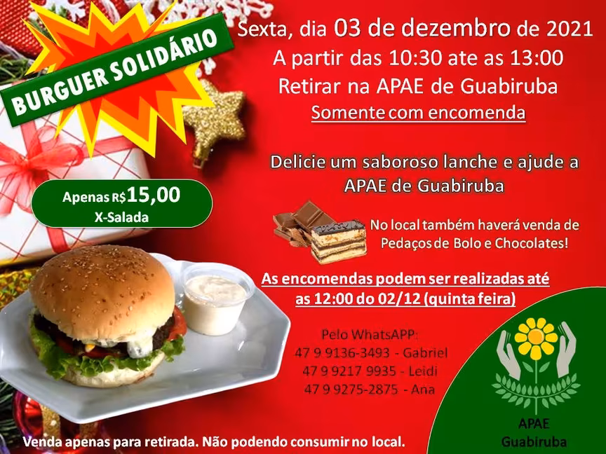 A Apae de Guabiruba promove o evento "Burguer Solidário" nesta sexta-feira, 3. O X-Salada custa R$ 15 e estará disponível apenas para retirada na sede da instituição.