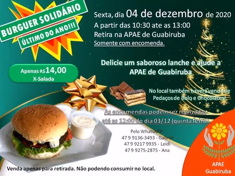 A Apae de Guabiruba realiza nesta sexta-feira, 4, última edição do ano do Burguer Solidário. Os lanches devem ser encomendados até quinta-feira, 3, às 12h, para retirada no dia seguinte entre 10h30 e 13h. No local também haverá venda de bolos e chocolates.