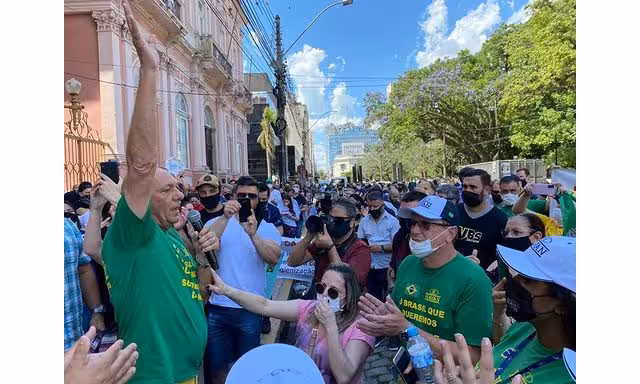 "Imagina, em pleno mês de dezembro, fecharam a cidade de Pelotas. Não funciona restaurantes, bares, hotéis, comércio, está tudo fechado", conta. "Eu faço uma manifestação em prol do emprego, do desenvolvimento, aí vou embora, tem dez pessoas aqui me esperando para pegar uma assinatura", mostra no vídeo.