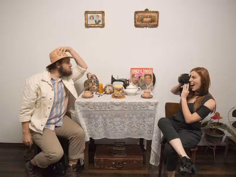 Ela explica que a peça é totalmente inspirada nas entrevistas que foram feitas durante a pesquisa. “A partir disso, foram criados os personagens Trude e Rubens, que formam um casal de idosos típico da cidade e que voltam ao passado por meio de um álbum de fotografia e do rádio”.
