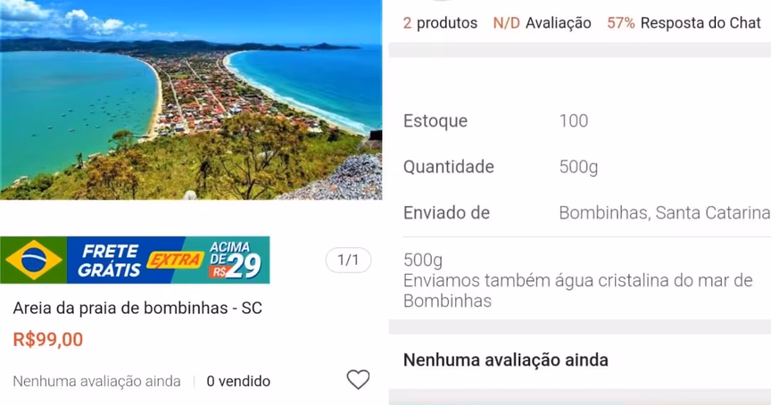 Um perfil na Shopee, um site de vendas on-line, está "vendendo" a areia da praia de Bombinhas. De acordo com a proposta, o consumidor que comprar a areia recebe também a "água cristalina do mar da ilha". Na descrição, ainda consta que o vendedor possui 100 itens no estoque.