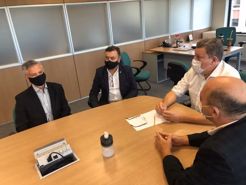 O prefeito de Brusque, Ari Vequi, em conjunto com o secretário municipal de Desenvolvimento Econômico e Turismo de Brusque, Ademir José Jorge, e com o presidente do Comitê de Implantação do Centro de Inovação de Brusque, Günther Lother Pertschy, estiveram em Florianópolis para uma audiência com secretário de Estado do Desenvolvimento Econômico Sustentável, Luciano José Buligon.