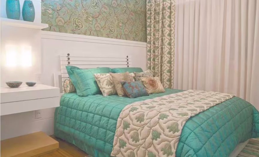 A capa trazia o projeto da Katia Menezes, que destacava a suíte em tons de azul tiffany. Papel de parede e outros acabamentos com a mesma nuance de azul compunham o restante da decoração. Na marcenaria, tons de bege e branco