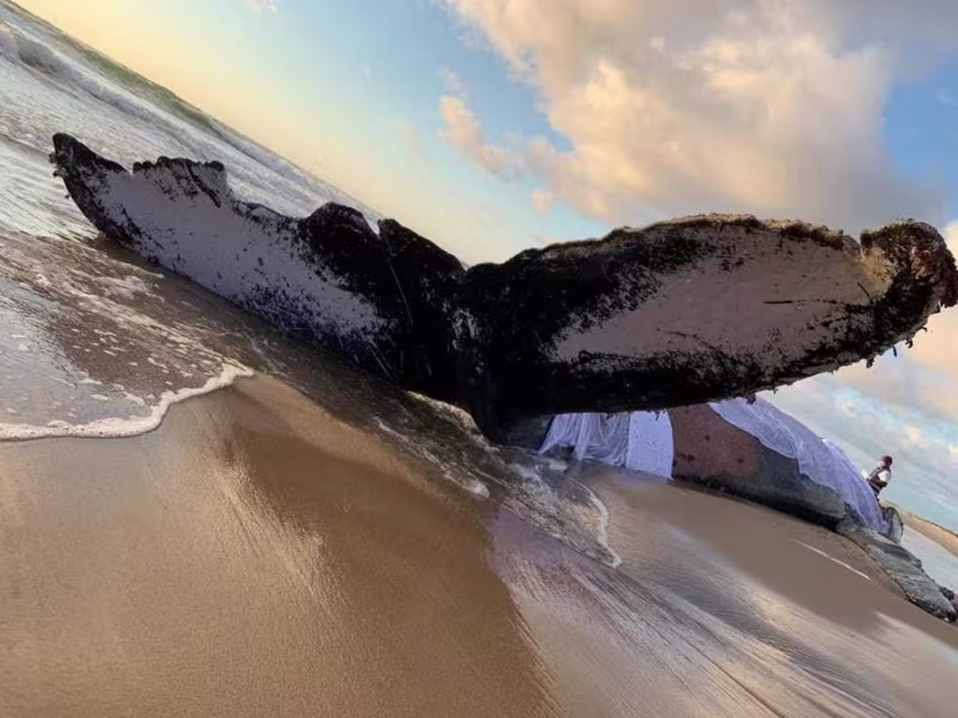 Baleia-jubarte morre após encalhar em praia no Norte do estado