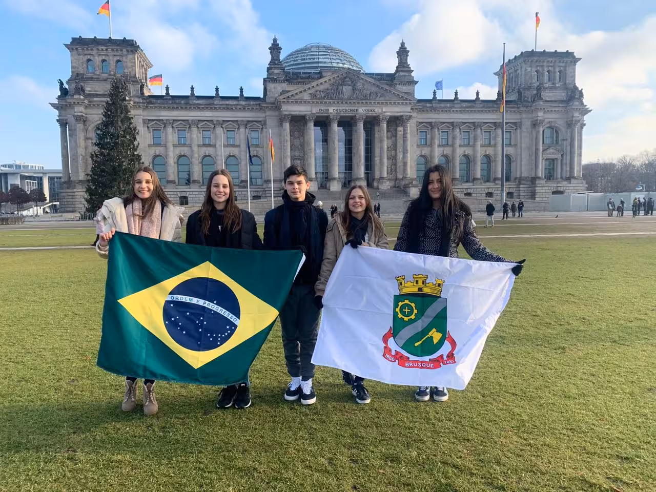 A Banda Elas e o Jairo é formada por Ana Carolina Zuqui Menin Costa (guitarra e vocal), Bruna Evelyn Sapelli (bateria), Gabriela Diegoli Gamba (teclado), Jairo Hassamann Formiga (percussão) e Sofia Romanenko Halfpap (baixo), jovens brusquenses de 15 anos, estudantes do Colégio Consul e Colégio Universitário. O concurso tem como lema Alle für Eine Welt – Eine Welt für alle (Todos por um só mundo – um só mundo por todos), e busca reflexão sobre grandes problemas mundiais e missóes globais. O concurso acontece a cada dois anos. A banda esteve em Berlim em dezembro do ano passado para a gravação da música. “Foi muito marcante, vai ficar para sempre, nem tenho palavras para descrever. Fomos muito bem tratados pelas pessoas do concurso, por toda a equipe. Não nos sentimos deslocados em nenhum momento, tinha dois pessoas que falavam português. Poucas pessoas têm essa oportunidade, e a gente conseguiu aproveitar muito bem”, lembra a vocalista e guitarrista do grupo, Ana Carolina. Jairo, percursionista, conta que eles tiveram interação com músicos profissionais e também participaram de workshops. Bruna, baterista, destaca a experiência de gravar a música em um ambiente profissional, diferente do que estavam acostumados. “A gente sempre tocava na garagem e ficamos muito fascinados com aquele estúdio. Foi uma viagem incrível, adquirimos muitas experiências e podemos conhecer a cultura, fazer vários amigos. Um momento único, de viajar com a banda e também de passar nossa mensagem”. Um festival em Berlim estava marcado para junho, com a apresentação de todos os selecionados, mas foi transferido para o outono alemão por causa da pandemia de Covid-19. A baixista Sofia conta que não tiveram contato com outras bandas na primeira visita, mas que estão na expectativa. “Estamos muito ansiosos para o festival. Lá encontraremos as bandas vencedoras e com certeza vai ser uma experiência marcante”. A premiação do concurso envolve prêmio em dinheiro e a gravação das músicas premiadas em estúdio para composição do álbum Eine Welt (Um Só Mundo) Volume 3. A música “Só de Nós” alerta que toda a população é responsável pelo que acontece no planeta. Além disso, chamam a atenção para a situação do desmatamento desenfreado da Amazônia, que afeta todo o mundo. O vídeo da música está disponível na página do Facebook da banda: www.facebook.com/elaseojairo/.