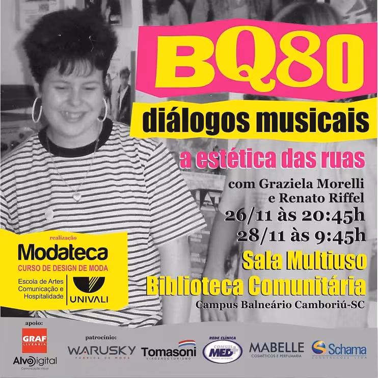 A programação continua: hoje às 20h45 e na próxima quarta, às 9h45, Graziela Morelli e Renato Riffel repetem a conversa que já trouxeram para Brusque, sobre a estética das ruas. Os eventos acontecem na Biblioteca Central do Campus Balneário Camboriú da Univali. E vale a pena!