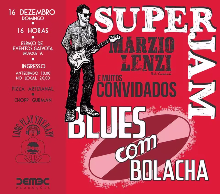 Mais uma dica do tipo imperdível. Esta roubei, foto e convite, do Luís Brusque: "para fechar o ano, a dupla Demian Moritz e Patrick Kühn da LongPlayTherapy trazem a quinta edição do BLUES COM BOLACHA, lá no espaço Gaivota, no domingo que cai no dia 16 de dezembro. Dessa vez o guitarrista MARZIO LENZI convidou uma penca de músicos (na lista só tem estrelas do blues) para uma SUPERJAM – vai ter blues para todos os gostos. Anota aí na tua agenda!!! Domingo de tarde, vale para todas as idades."