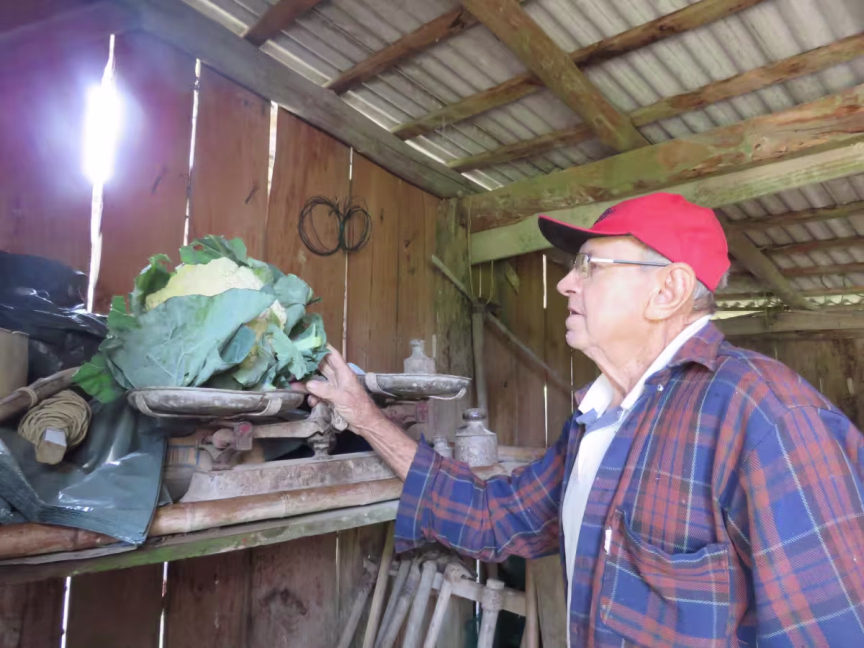 Nem uma forte gripe o impede de cuidar de seu patrimônio diariamente. Logo que a reportagem do jornal O Município e Bruno chegam ao local, chega também uma senhora da região, freguesa, pedindo couve-flor e alface. O agricultor faz a colheita, calcula o preço total da compra, de R$ 7, e sugere um fiado, mas a cliente faz questão de pagar na hora.