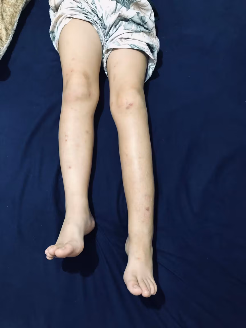 Hoje, com seis anos de idade, Guilherme possui manchas café com leite pelo corpo todo e pintas nas axilas virilha. Além dos nódulos e das dores pelo corpo.