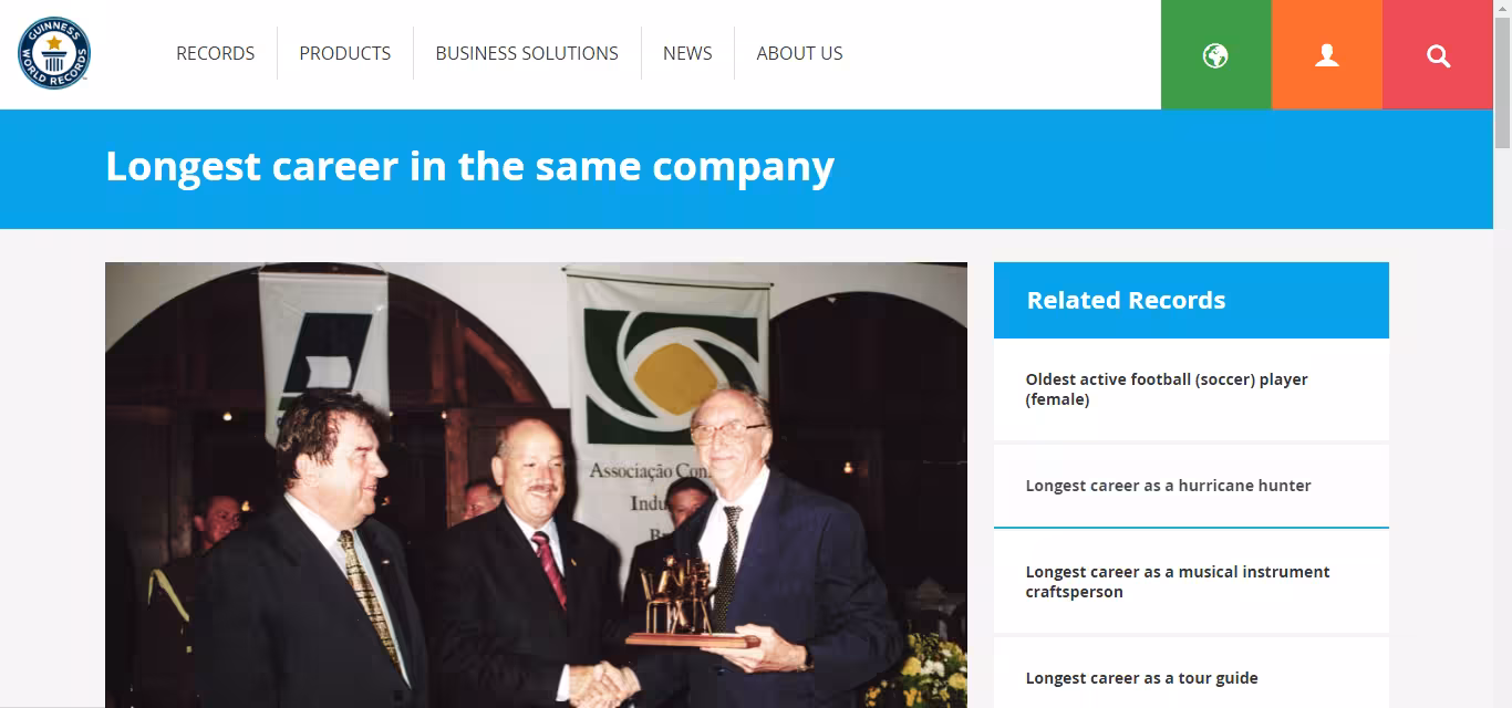 "A carreira mais longa na mesma empresa é de 80 anos e 75 dias, e foi conquistada em 2 de abril de 2018 por Walter Orthmann (nascido em 1922, no Brasil), que começou a trabalhar nas Indústrias Renaux S. A. em 17 de janeiro de 1938 e continua a trabalhar na mesma empresa, que atualmente se chama RenauxView, em Brusque, Santa Catarina, Brasil.