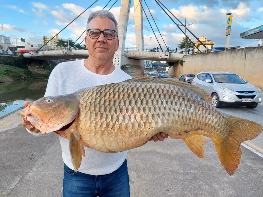 Brusquense pesca carpa de 24 quilos no rio Itajaí-Mirim nesta quinta-feira