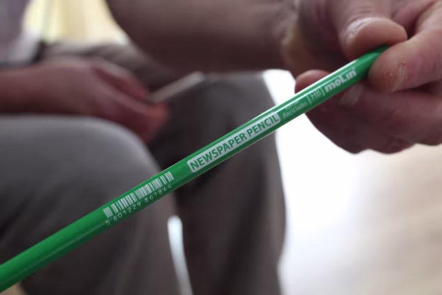 Outro item que chamou muito a atenção do colecionador foi o lápis ecológico, feito todo de jornal, que ganhou de um amigo que viajou a Capão da Canoa, no Rio Grande do Sul. Na época, ele já colecionava há dez anos. "Hoje esses lápis já são mais comuns, mas, na época, eu nunca tinha visto um assim. Fiquei bem impressionado." Ao invés de madeira, o grafite é revestido com papel jornal reciclado.