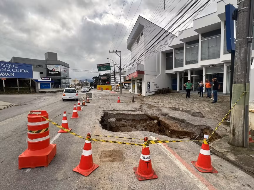 Buraco na avenida Primeiro de Maio aumenta após as chuvas em Brusque