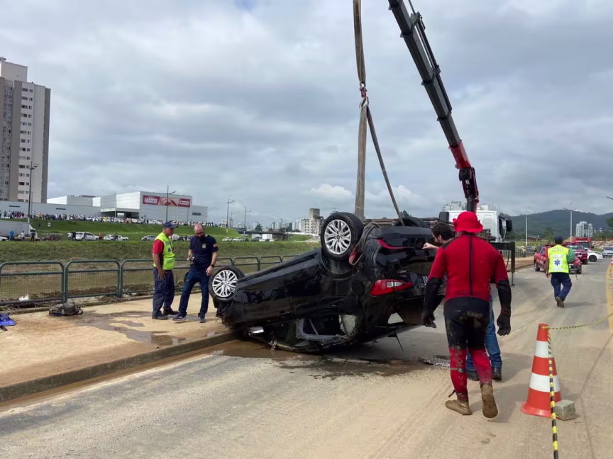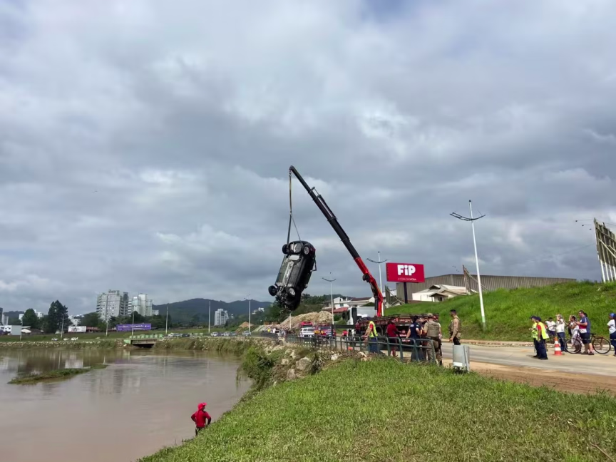 O Fiat Argo de cor preta que caiu no rio Itajaí-Mirim, em Brusque, foi localizado e retirado da água na manhã desta sexta-feira, 2. Segundo o Corpo de Bombeiros, as buscas estão suspensas no momento devido à forte correnteza do rio. É necessário aguardar a melhoria da condição das águas para os mergulhadores atuarem.