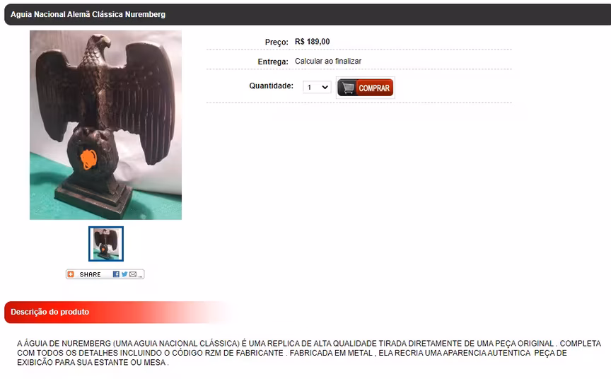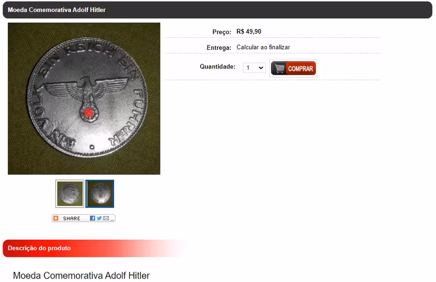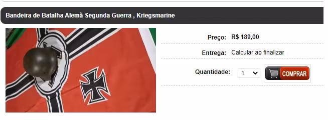 “Produtos antigos de coleção que possuem símbolos devem ser tapados. Isso é em qualquer país, até na Alemanha. É permitido a venda de produtos originais e deve ser tapado. Se quiser posso mostrar outros 40 sites no Brasil que vendem esses itens”, complementou e explicou ele, sobre a suástica tampada nas fotos.