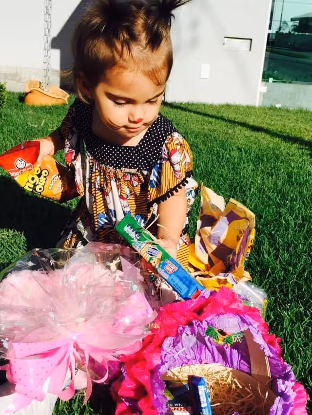 “Bem cedinho, acordamos e já montamos a caça aos ovos. Colocamos os ovos espalhados no jardim, fazemos um caminho de balas, ovinhos, chocolates, até a cesta dela. Depois a gente espalha outros ovos pelo jardim”, conta Elaine.