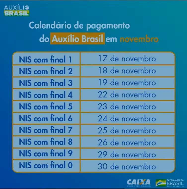 Com valor médio de R$ 217,18 neste mês, a parcela de novembro começará a ser paga hoje para os beneficiários de NIS com final 1 e terminará no dia 30 para os beneficiários de NIS com final 0. Assim como no Bolsa Família e no auxílio emergencial, o pagamento será feito pela Caixa Econômica Federal. O governo pretende que o programa chegue a 17 milhões de famílias nos próximos meses.