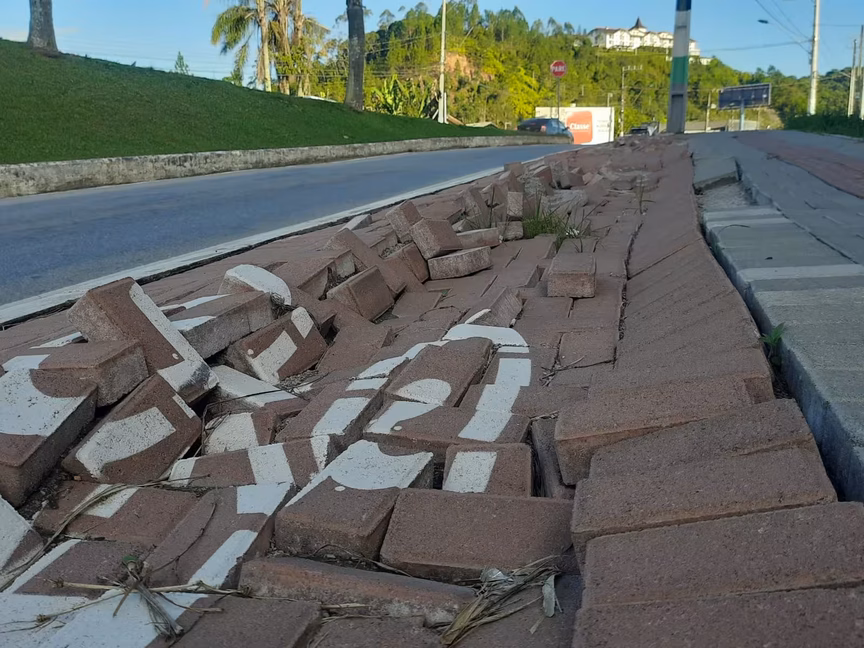 Parte da calçada na rua Marcílio Dias, no Centro II, foi danificada em Brusque. As imagens mostram um afundamento no local, o que levantou suspeitas de problemas de drenagem na obra do parque Linear, que ainda está sendo executada.