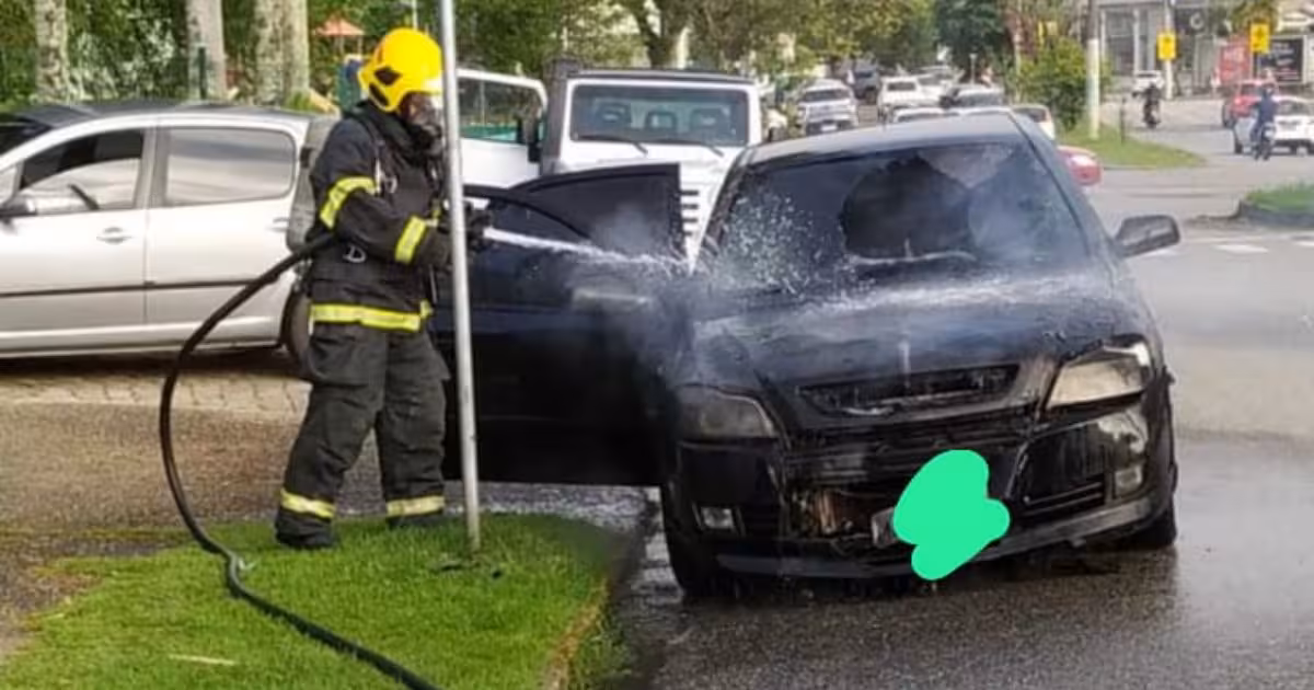 Carro com placas de Guabiruba pega fogo perto de colégio no Maluche, em Brusque