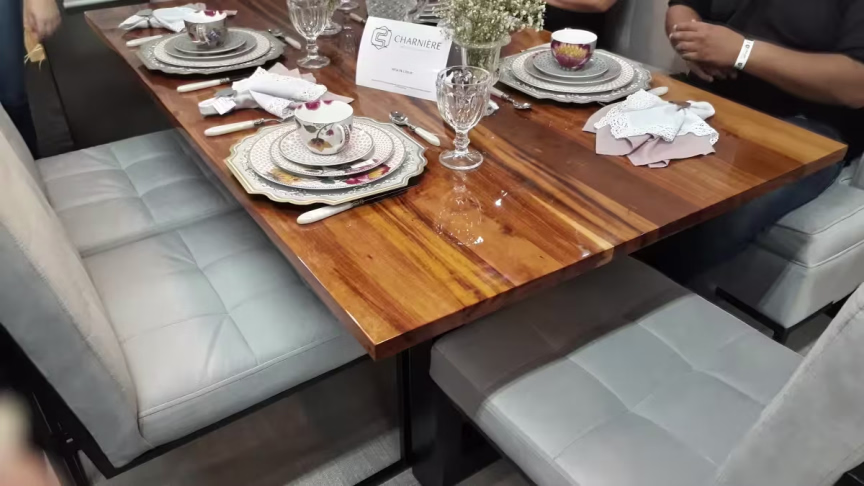 Como a empresa fabrica móveis sob medida, expôs no evento algumas tendências de mercado. Uma delas é uma mesa de jantar que combina madeira, ferro e estofados. O tampo da mesa tem verniz de automóvel.