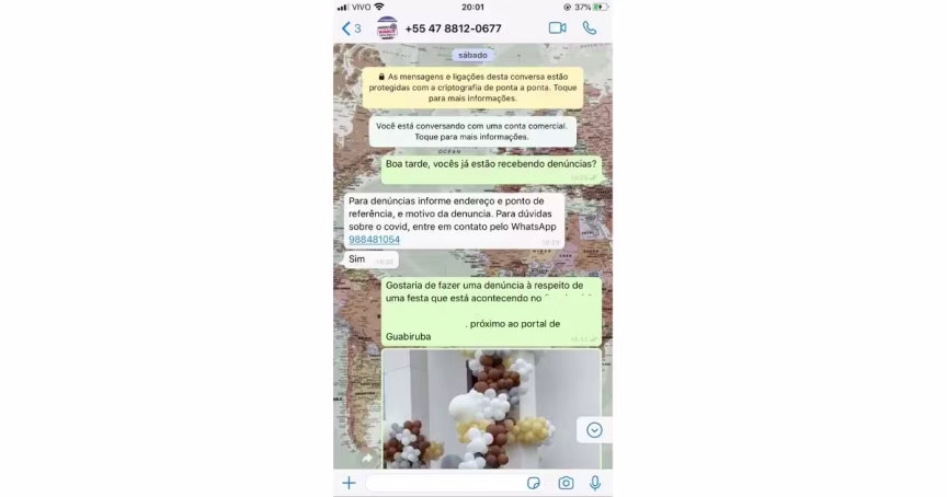 Além disso, segundo a denúncia, foi prestada queixa sobre o evento ao telefone do Disk Denúncia da Prefeitura de Brusque, e de acordo com a denunciante não obtiveram resposta sobre o caso. Confira abaixo o print da conversa: