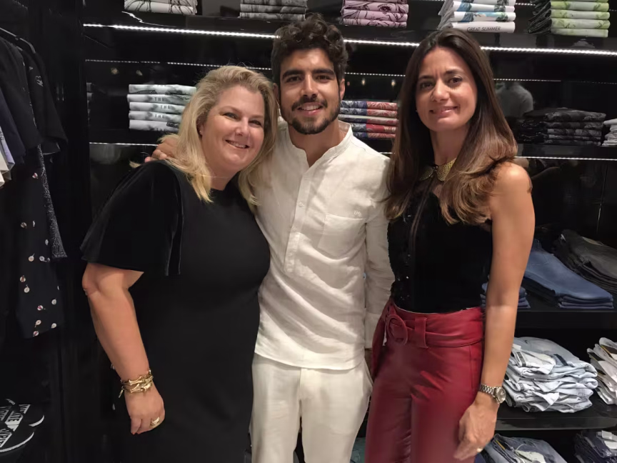 Alexia Belli Nikel, de Brusque, e Elizângela Cardoso, recebendo o ator Caio Castro na loja Colcci do Balneário Shopping esta semana. Foto André Groh