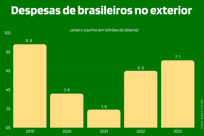 Um olhar mais atento revela que os brasileiros gastaram um total de US$ 7,1 bilhões em viagens internacionais durante o primeiro semestre de 2023, marcando um aumento significativo de 18,4% em comparação com o mesmo período de 2022. Esses gastos representam o valor mais alto desde 2019 para esse período.