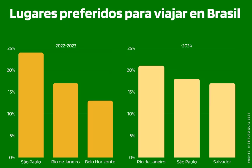 Em termos de destinos desejados para 2024, o Rio de Janeiro, São Paulo e Salvador lideram a lista, com 21%, 18% e 17%, respectivamente. Eles são seguidos de perto por Fortaleza (16%) e Florianópolis (15%). A gerente de Serviços e Planejamento do Instituto QualiBest, Fábia Duarte, ressalta que, apesar da região Nordeste do Brasil ser um destino importante, muitos viajantes ainda não o exploraram completamente.