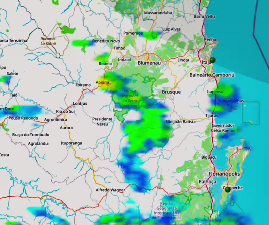A imagem anexada a seguir é do Radar do Comando da Aeronáutica, atualizada às 18h desta sexta-feira. Podemos observar a chuva no Vale do Itajaí ilustrada nas manchas em verde e amarelo da figura do mapa: