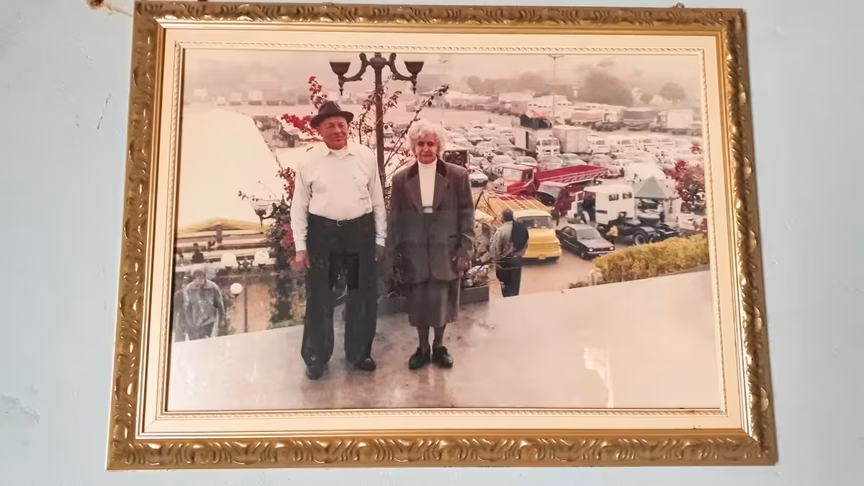 Na parede ainda permanece o retrato onde aparece o casal Arnoldo e Alvina. Eles posam juntos, tendo ao fundo, o bairro Aymoré em mais uma festa dos motoristas, na época.