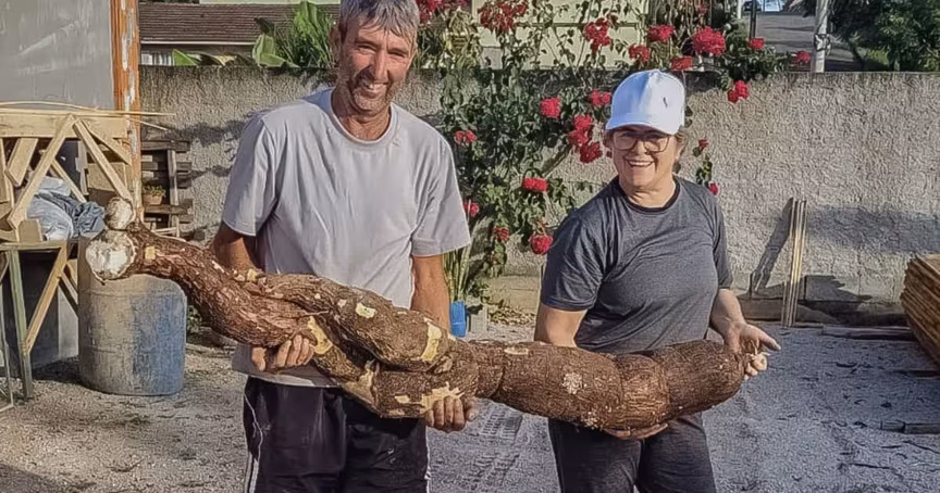 Dirceu Piffer e Marlene Darold, moradores do loteamento Planalto, em Brusque, se tornaram protagonistas de uma história surpreendente. Enquanto cuidavam de seu terreno no bairro Nova Brasília, onde costumam descansar e manter a área limpa, eles se depararam com uma raiz de mandioca extraordinária, pesando cerca de 30 quilos.