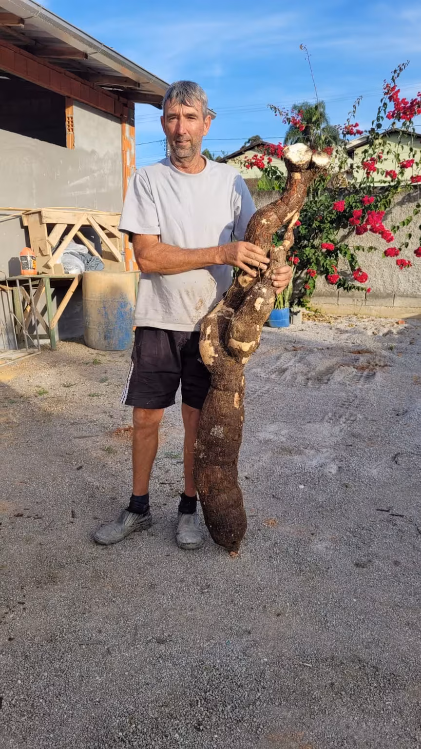 Dirceu compartilhou com orgulho o ocorrido, afirmando que não é todo dia que se colhe um aipim desse tamanho. A raiz gigante se tornou motivo de admiração entre seus amigos e vizinhos, que ficaram surpresos com o resultado dessa plantação especial.