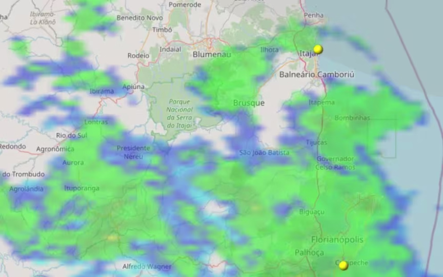 A imagem de radar, atualizada às 15h50 desta sexta-feira, apresentava nesse horário, chuva abrangente no Vale do Itajaí. Podemos observar a precipitação nas manchas em verde da figura do mapa: