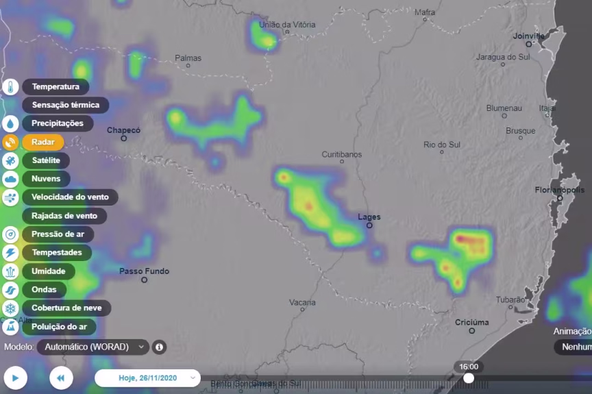 Na imagem de radar exibida a seguir, podemos ver vários núcleos de trovoadas no horário das 16h. Estão ilustrados nas manchas coloridas da figura do mapa.
