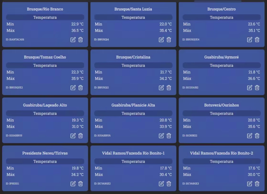 Acompanhe na tabela abaixo, as temperaturas extremas (mínimas e máximas) assinaladas por todo o Vale do Itajaí-Mirim nesta quinta-feira: