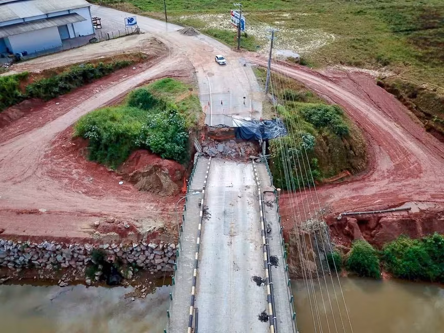 Na noite de quarta-feira, 21, foi registrada em Brusque, a queda da cabeceira da ponte Santos Dumont, em sua margem esquerda do rio Itajaí-mirim, que faz a ligação entre os bairros Santa Terezinha e Steffen.