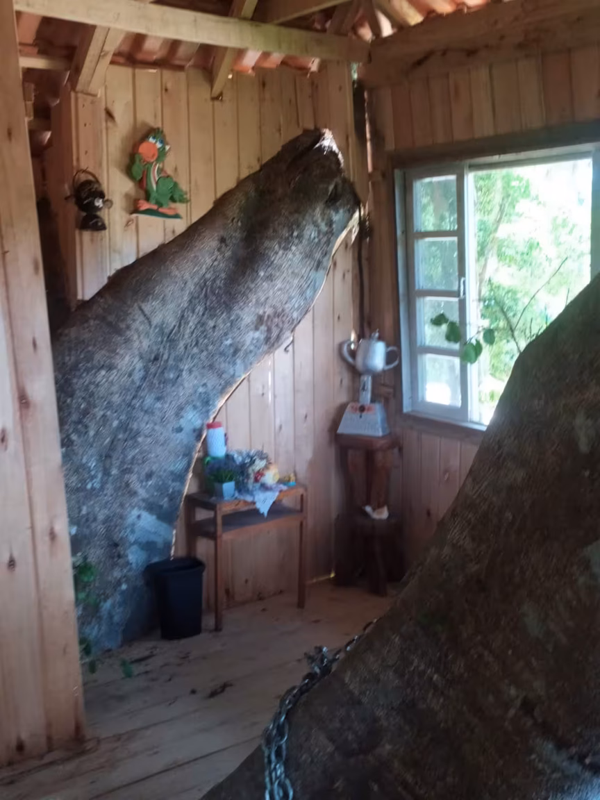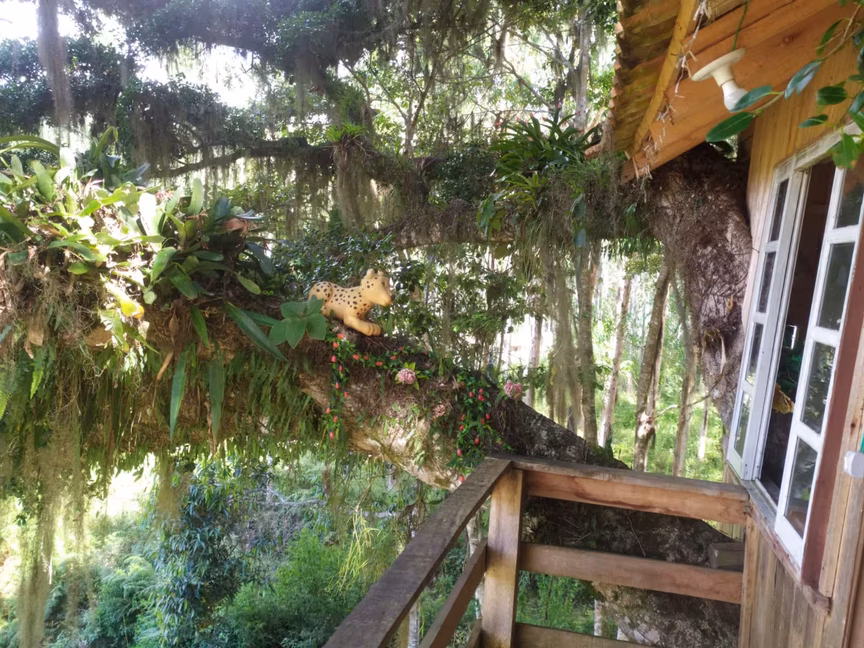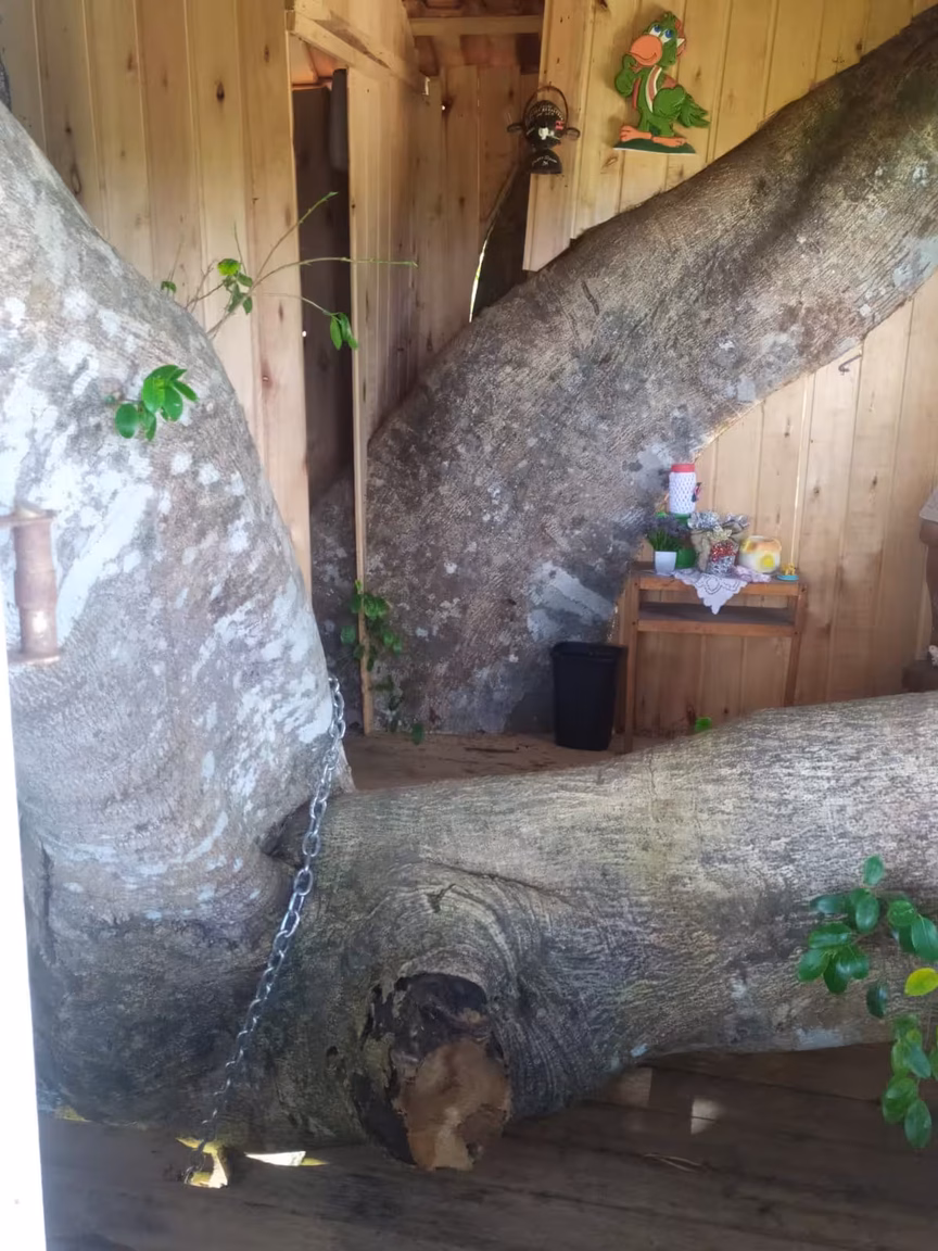 Quem passa pela estrada geral Vargem dos Bugres, em Leoberto Leal, mesmo de longe já pode avistar a casa no alto da figueira, pois é impossível não notar essa imponente estrutura ali montada.